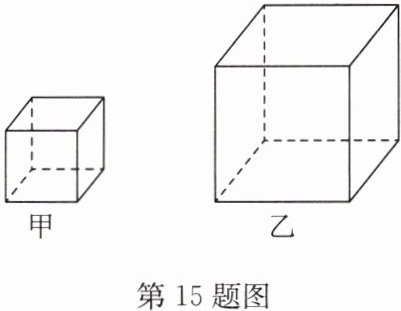15. 如图所示, 甲、乙两质地均匀的正方体放在水平地面上, 它们的棱长之比 $ L_{甲}:L_{乙}=1:2 $, 质量之比 $ m_{甲}:m_{乙}=2:3 $, 甲、乙的密度分别为 $ \rho_{甲} $、$ \rho_{乙} $, 甲、乙对地面的压强分别为 $ p_{甲} $、$ p_{乙} $, 下列计算正确的是 (