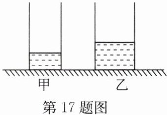$ \frac{1}{2}p_0 $. (均填“>”“=”或“<”)答案:17. $>$ $<$ 点拨:两杯的底面积$S_{乙} = 2S_{甲}$,且两杯的质量相同,即两杯的重力$G_{杯}$相等。两杯中装入一定量的水后,杯子对水平桌面的压力$F = G_{杯} + G_{水}$,甲杯对水平桌面的压力$F_{甲} = G_{杯} + G_{水甲}$,乙杯对水平桌面的压力$F_{乙}=G_{杯} + G_{水乙}$,两杯对水平桌面的压强$p_{0}=\frac{F_{甲}}{S_{甲}}=\frac{F_{乙}}{S_{乙}}$,因为两杯对桌面的压强相等,且$S_{乙} = 2S_{甲}$,所以$F_{乙} = 2F_{甲}$,即$G_{水乙} = G_{杯} + 2G_{水甲}$;将乙杯中水倒入甲杯中后,甲杯对水平桌面的压力$F_{1} = F_{甲} + G_{水乙} = 2F_{甲} + G_{水甲}$,乙杯对水平桌面的压力$F_{2} = G_{杯}$,甲杯对水平桌面的压强$p_{1}=\frac{F_{1}}{S_{甲}}=\frac{2F_{甲} + G_{水甲}}{S_{甲}}>\frac{2F_{甲}}{S_{甲}} = 2p_{0}$,乙杯对水平桌面的压强$p_{2}=\frac{F_{2}}{S_{乙}}=\frac{G_{杯}}{2S_{甲}}<\frac{F_{甲}}{2S_{甲}}=\frac{1}{2}p_{0}$。
