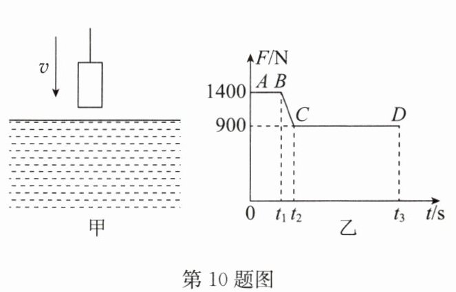 10. 如图甲所示,石料在钢绳拉力的作用下从水面上方以恒定的速度下降,直到全部没入水中,然后石料继续下降一段距离;图乙是钢绳拉力F随时间t变化的图像.若不计水的阻力,则石料的密度为(