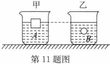 11. 如图所示,水平桌面上甲、乙两相同的容器装有体积相等的不同液体.将同种材料制成的实心物体A、B分别放入甲、乙两容器中,静止时两容器中的液面保持相平,则(