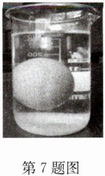 7. 小欧将质量为55g、体积为50cm³的鸡蛋放入盛清水的烧杯中,鸡蛋下沉.向烧杯中加盐并搅拌,直至鸡蛋悬浮在盐水中(如图).求:(g取10N/kg,$\rho_{水}=1.0×10^{3}$kg/m³)