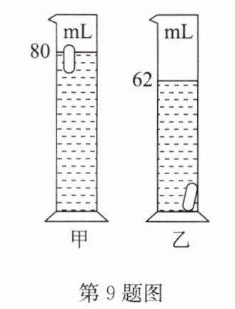 9. 物理兴趣活动中,小明测量制成玻璃瓶的玻璃的密度,在量筒中倒入50mL的水,将玻璃瓶瓶口朝上放入量筒中,玻璃瓶漂浮在水中静止时水面在80mL刻度线处,如图甲所示.再将玻璃瓶中空气排尽,瓶口朝下沉入量筒底,此时水面在62mL刻度线处,如图乙所示.图甲中玻璃瓶受到的浮力为