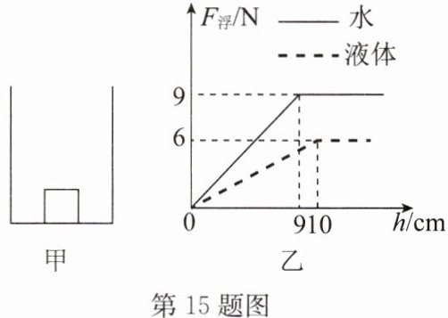 15. 棱长为10cm的正方体物块($\rho_{物}<\rho_{水}$)放入圆柱形容器底部,如图甲所示.逐渐向容器内倒入水(水未溢出),测量容器内水的深度h,分别计算出该物块对应受到的浮力$F_{浮}$,并绘制了如图乙(实线)所示的图像.(g取10N/kg,$\rho_{水}=1.0×10^{3}$kg/m³)
