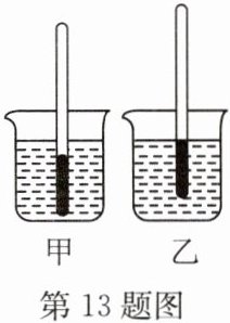 13. 某项目小组的同学在铅笔(不吸水)一端缠绕数圈细铁丝自制了一支密度计,分别放入甲、乙两种密度不同的液体中.如图所示,待密度计静止时,两烧杯中的液面一样高.下列说法正确的是(