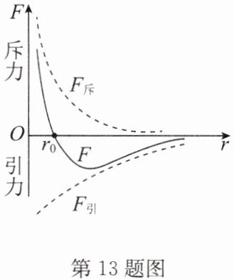 13. 如图所示为分子间作用力与距离关系的图像,$r_{0}$表示引力和斥力大小相等时分子间的距离,$F_{斥}$表示斥力曲线,$F_{引}$表示引力曲线,$F$表示合力曲线. 当$r>r_{0}$时,分子间的作用力表现为