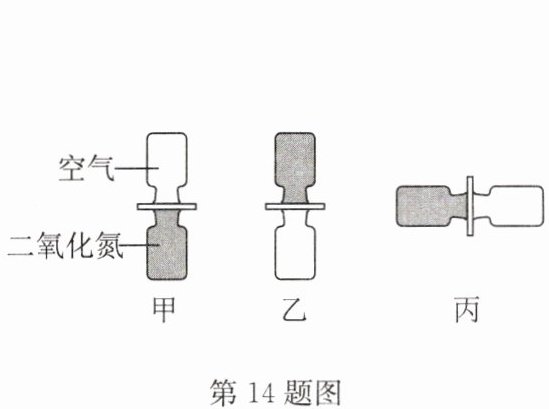 14. 将两个分别装有空气和红棕色二氧化氮气体($\rho_{二氧化氮}>\rho_{空气}$)的玻璃瓶口对口对接,中间用玻璃板隔开,抽开玻璃板后,两瓶中气体都变成红棕色,该现象说明了分子处在