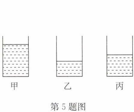 因杯子规格相同,液面高度$h$与体积$V$成正比,观察图知液面高度:甲>丙>乙,故体积$V_{甲}>V_{丙}>V_{乙}$。