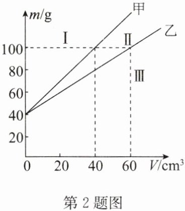 2. 某同学研究液体的密度时,用两个完全相同的容器分别装入甲、乙两种液体,并绘制出总质量m与液体体积V的关系图像(如图所示),由图像可知,(1)容器的质量为