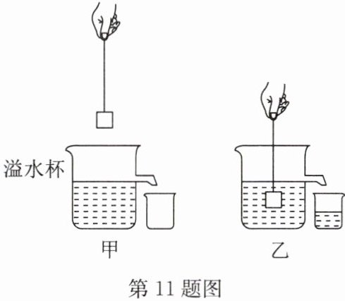 11. 某同学利用如图所示的装置测量一金属块的密度. 先在溢水杯中装满水,如图甲所示. 再将一质量为790g的金属块浸没在水中,如图乙所示,测得溢水杯中溢出水的质量为100g. 下列说法正确的是 (