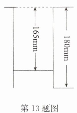 13. 降雪量是用一定面积的雪化成水后的高度来衡量的,一场大雪后,小明用刻度尺测出水平地面上雪的厚度为180mm,再用铁板将雪夯实成冰,测出夯实雪坑的深度为165mm(如图所示).已知$ρ_{水}=1.0×10^{3}kg/m^{3},ρ_{冰}=0.9×10^{3}kg/m^{3}$.这场大雪的降雪量约为(
