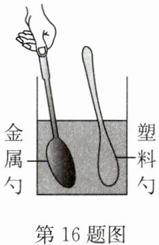 16. 如图所示,将金属勺与塑料勺同时放入同一杯热水中,一段时间后,用手触摸勺尾,发现塑料勺不烫手,而金属勺很烫,主要是因为金属勺具有(