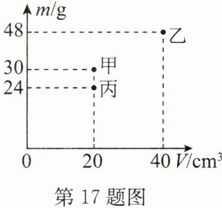 假设B正确,$m_0 = 18g$,则甲液体质量$30g - 18g = 12g$,$\rho_{甲} = 12g / 20cm^3 = 0.6g/cm^3$;丙液体质量$24g - 18g = 6g$,$\rho_{丙} = 6g / 20cm^3 = 0.3g/cm^3$;乙液体质量$48g - 18g = 30g$,$\rho_{乙} = 30g / 40cm^3 = 0.75g/cm^3$,无矛盾,但需验证C。