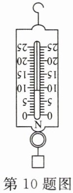 10. 某同学在用已校零的弹簧测力计测量一物体的重力时,误将弹簧测力计倒置,物体挂在了拉环上,如图所示. 当物体静止时,弹簧测力计的指针正好对齐 9N 刻度线,则该物体的重力(