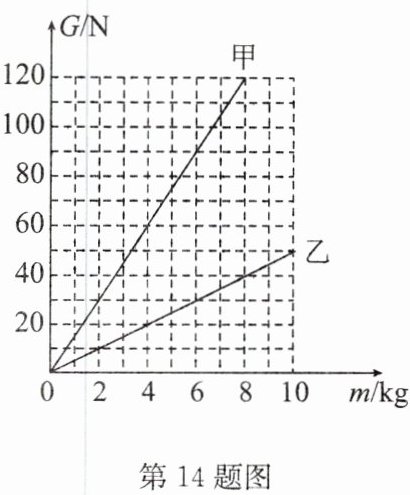 14. 小明在科技博览阅读中,查阅了不同星球上重力与质量的关系,如图所示. 通过图像可知,在甲、乙两个星球上,重力与质量都成