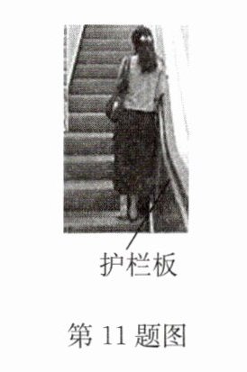 11. 小芳从地面跨步到上行的自动扶梯时,身体适当前倾,这是为了防止由于