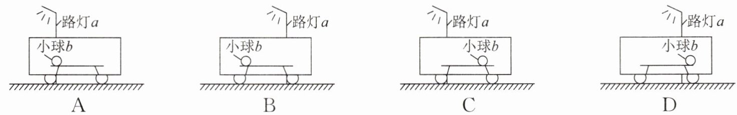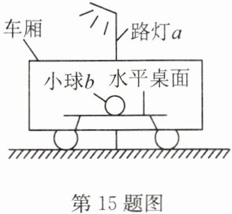 15. 如图,列车停在平直轨道上,车厢中小球b静止,忽略桌面对小球b的摩擦及空气的影响。列车启动后,下列选项中的情况可能出现的是(