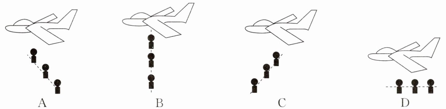 16. 从一架沿水平方向匀速飞行的飞机上先后落下三颗炸弹,在不计空气阻力的条件下,在炸弹未落地之前,站在地面上的人看到飞机和三颗炸弹的运动情况是(