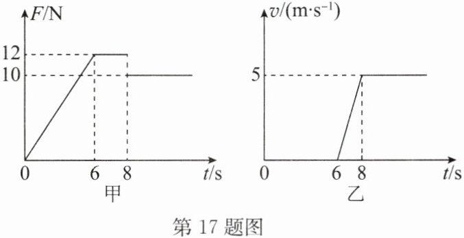 答案:17. B 点拨:由题中 $ v-t $ 图像可知,在 $ 0 ∼ 6s $ 内,木块的速度为 0,处于静止状态,受到的推力等于静摩擦力,故 A 错误,B 正确;由题中 $ v-t $ 图像可知,在 $ 6 ∼ 8s $ 内,木块做加速运动,8s 后木块做匀速直线运动,木块处于平衡状态,受到水平向右的推力和水平向左的滑动摩擦力是一对平衡力,由二力平衡条件和 $ F-t $ 图像可得:$ f = F = 10N $;因滑动摩擦力的大小只与接触面的粗糙程度和压力的大小有关,与运动的速度无关,故在 $ 6 ∼ 8s $ 内,木块做匀加速直线运动,木块受到的摩擦力仍然为 10N,故 C 错误;由题中 $ F-t $ 图像可知,在 $ 0 ∼ 6s $ 内,木块受到的最大推力为 12N,由题中 $ v-t $ 图像可知,在 $ 0 ∼ 6s $ 内,木块静止,处于平衡状态,所以,当 $ F = 11N $ 时,木块可能处于静止状态,故 D 错误。