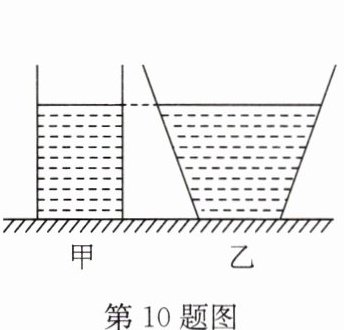 10. 如图所示,水平桌面上有甲、乙两个质量和底面积都相等的容器. 向容器中注入深度相等的水,水对容器底部的压强 $ p_{甲} $