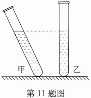 11. (2024·常州)如图所示,甲、乙两支完全相同的试管内分别装有质量相等的不同液体,甲试管倾斜,乙试管竖直,两试管内液面相平. 甲试管内的液体密度为 $ \rho_{甲} $,液体对试管底部的压强为 $ p_{甲} $,乙试管内的液体密度为 $ \rho_{乙} $,液体对试管底部的压强为 $ p_{乙} $,则 $ \rho_{甲} $