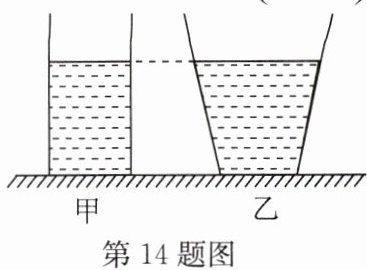 答案:14. D 点拨:水平桌面上,甲、乙两个容器中两种液体的质量相等,容器的质量相等,根据 $G = mg$ 可知,二者的总重力相等,故容器对桌面的压力 $F_{甲} = F_{乙}$,容器的底面积相同,由 $p = \frac{F}{S}$ 可知,容器对桌面的压强 $p'_{甲} = p'_{乙}$,故①错误,④正确;从题图可知乙中液体的体积大于甲中液体的体积,因为液体的质量相等,根据 $\rho = \frac{m}{V}$ 可知,$\rho_{甲} > \rho_{乙}$,因两容器中液体的深度相同,根据 $p = \rho_{液}gh$ 可知,液体对容器底部的压强 $p_{甲} > p_{乙}$,故②错误,③正确。