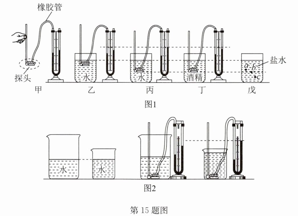 .答案:15. (1) 相平 (2) 深度越深 丁 (3) $a$ (4) 没有控制探头在液体中的深度相同 (5) 换用密度不同的液体多次实验