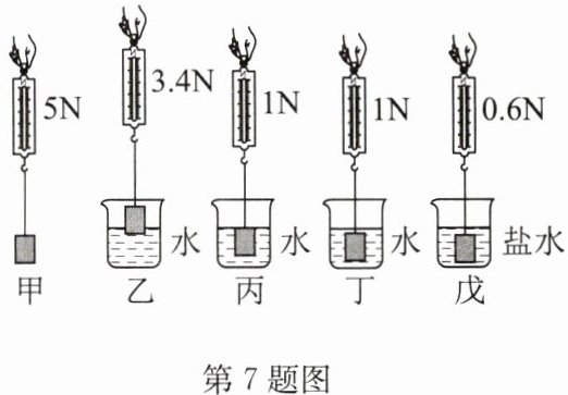 7. 小明用弹簧测力计、圆柱体、两个相同的烧杯,分别装有一定量的水和盐水,对浸在液体中的物体所受的浮力进行了探究,其装置和弹簧测力计的示数如图所示。