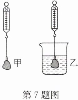 7. 小鹏同学对一个金属块进行了两次测量:第一次如图甲所示,用细线系住金属块挂在弹簧测力计上,弹簧测力计的读数为2.7N.第二次如图乙所示,让金属块浸没在盛水的杯子中,这时弹簧测力计的读数为1.7N.求:(g取10N/kg,$\rho_{水}=1.0×10^{3}kg/m^{3}$)
