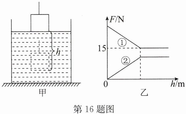 16. 如图甲所示,桌面上一个质量为15kg的薄壁圆柱形容器中注入适量的水,一棱长为10cm的正方体物块被缓缓沉入水中.在沉入过程中,其下表面到水面的距离为h,随着h的增大,细绳的拉力$F_{拉}$、物体所受浮力$F_{浮}$的变化情况如图乙所示(物块未接触容器底部,水未溢出). ($\rho_{水}=1.0×10^{3}kg/m^{3}$,g取10N/kg)