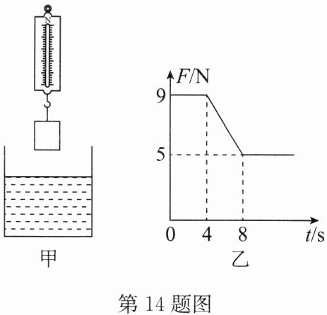 14. 如图甲,弹簧测力计下挂一长方体物体,将物体从盛有适量水的烧杯上方离水面某一高度处缓缓下放,然后将其逐渐浸入水中;图乙是弹簧测力计示数F随物体下降时间t变化的图像,则下列说法中正确的是 (