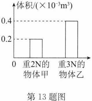 13. 甲、乙两物体的体积和受到的重力如图所示,把它们分别浸没在足量的水中,放手后可观察到(已知 $ \rho_{水}=1.0×10^{3}kg/m^{3} $,$ g $ 取 $ 10N/kg $) (