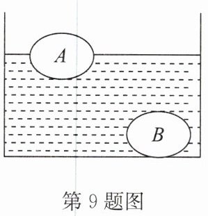 .(水的密度为 $ \rho $)答案:9. $ m_{A}g $ $ \rho gV_{B} $ 点拨: 鸡蛋 A 处于漂浮状态, 所以浮力等于自身的重力, 则鸡蛋 A 受到的浮力 $ F_{A} = G_{A} = m_{A}g $; 鸡蛋 B 下沉到容器底部, 所以浮力小于自身的重力, 鸡蛋 B 受到的浮力 $ F_{B} = \rho gV_{B} $.