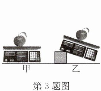 3. 如图所示,把一个苹果放在水平放置的电子秤上(如图甲所示),电子秤显示的示数为$F_{1}$,再把电子秤倾斜放置(如图乙所示),电子秤显示的示数为$F_{2}$.下列说法中正确的是(