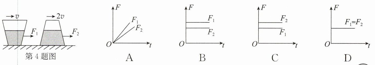 4. 两个用同种材料制成且完全相同的密闭圆台形容器一正一反放置在同一水平桌面上,容器内装有深度相同的同种液体,如图所示,若它们分别在水平方向拉力$F_{1}$和$F_{2}$的作用下沿桌面做匀速直线运动,速度分别为$v$和$2v$,则匀速运动时$F_{1}$、$F_{2}$随时间$t$的变化关系图像可能是(