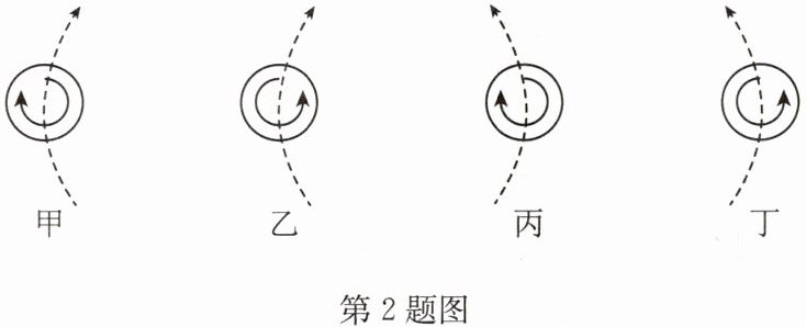 2. 打乒乓球时,有经验的队员会打出“侧旋球”. 球向前运动,空气相对于球向后运动,同时乒乓球在空中水平方向旋转,带动周围的空气流动,使乒乓球两侧的空气相对于球,一侧相抵,一侧加强,导致其两侧空气流速一慢一快,根据流速与压强的关系,乒乓球两侧所受压强一大一小,飞行路径发生水平转向. 图中给出了甲、乙、丙、丁四种乒乓球旋转方向与飞行路径的示意图,其中正确的是(