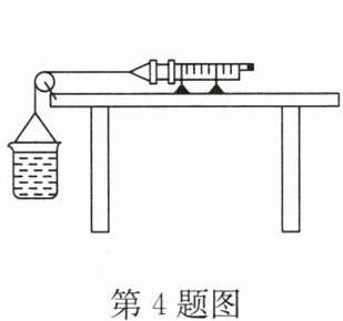 4. 在测量大气压的实验中,针筒活塞的面积为 $5× 10^{-5}m^{2}$,轮轴间的摩擦和细线重不计. 为消除活塞与针筒间的摩擦力对实验的影响,小明采用了图示装置,将注射器筒固定在水平桌面上,把活塞推至注射器筒底端,用橡皮帽封住注射器的小孔,活塞通过水平细线与烧杯相连,向烧杯中缓慢加水,当活塞刚开始向左滑动时,测得烧杯与水的总质量为 $0.69kg$;然后从烧杯中向外缓慢抽水,当抽出 $0.42kg$ 水时,活塞又开始向右滑动,则活塞与注射器筒之间的摩擦力为