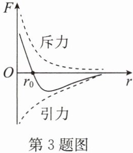 3. 图中的两条虚线分别是分子间斥力与引力随分子间距离变化的图像,以斥力为正值,以引力为负值,图中实线是分子间斥力与引力的合力随分子间距离变化的图像. 由图像可知,将两个铅柱底面削平并紧紧地压在一起,再在它们下面吊一个重物且重物不掉落时,接触面处铅原子间的距离