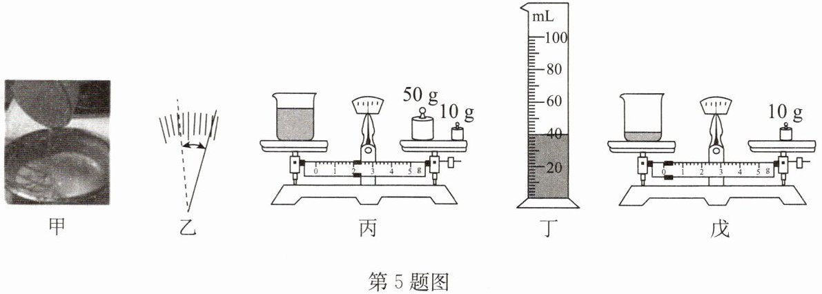 $ cm^3 $;如图戊所示,再测出剩余面浆水和烧杯的质量. 根据测量数据可知倒出的面浆水的质量为52