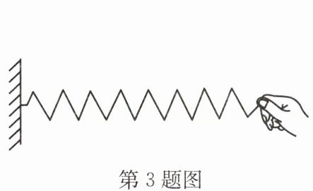 3. 如图所示,弹簧的一端固定在墙上,在弹性限度内,另一端用手向右拉长弹簧,手受到弹力是因为弹簧发生了