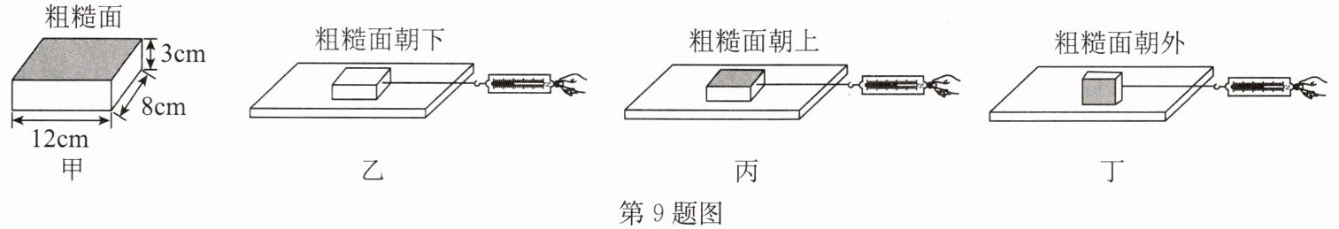 9. (2025·山东)小梅利用如图所示装置做“探究滑动摩擦力大小与哪些因素有关”的实验,所用的长方体木块如图甲所示,其中一个面粗糙程度较大,其他各面粗糙程度相同。