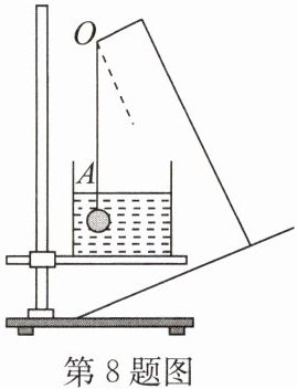 8. (2025·江阴期末)如图所示是“判断重力的方向”实验。为了能与重力的方向形成对比,使用了一杯水,以水面作为参考面,缓慢改变铁架台底面与水平桌面间的倾角,我们总观察到悬线 $ OA $ 的方向