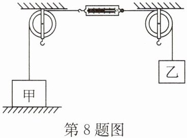 8. (2025·昆山期末)如图所示实验装置,甲重 10N,乙重 5N,若弹簧测力计、绳的自重及滑轮摩擦不计,当它们处于平衡状态时,弹簧测力计的示数与物体甲受到的合力分别为(