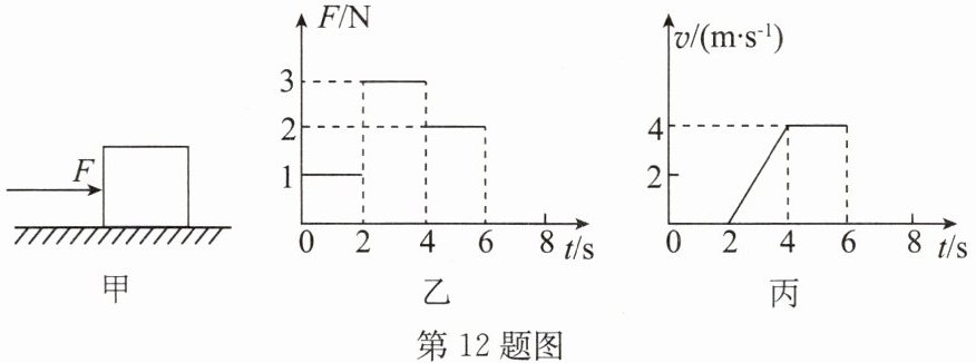 12. (2025·丹阳期末)如图甲所示,木块受到方向不变的水平推力 F 的作用,F 的大小与时间的关系和木块的速度 v 与时间 t 的关系分别如图乙、丙所示.