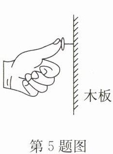 5. 如图所示,图钉尖的面积是 $ 5 × 10^{-8}m^{2} $,图钉帽的受力面积是 $ 1.0 × 10^{-4}m^{2} $,木板能承受的最大压强是 $ 6 × 10^{8}Pa $,手指至少要用