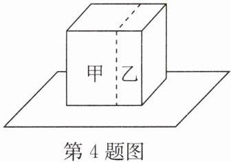 4. 把一个质地均匀的实心正方体放在水平桌面上,若从虚线沿竖直方向分成大小不同的两块,且底面积之比是$S_{甲}:S_{乙}=2:1$,如图所示.则甲、乙两块对桌面的压强之比$p_{甲}:p_{乙}=$