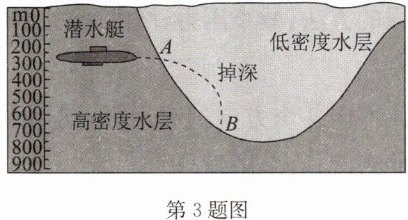 3. (2025·昆山期末)潜水艇从海水高密度区驶入低密度区,急剧下降的过程称为“掉深”。如图所示,某潜水艇从$A$处驶入低密度海水区,“掉深”到$B$处。与$A$处相比,潜水艇在$B$处(