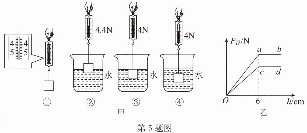5. 同学们用弹簧测力计、边长$6cm$的正方体铁块、烧杯等器材,探究浮力大小与物体浸在液体中的深度是否有关.