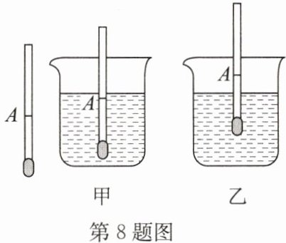 8. 小明把吸管的一端封口并缠绕细铁丝制作了一支简易密度计,将自制密度计直立在水中漂浮,在水面所对的位置做一个标记$A$. 两个相同的烧杯中盛有甲、乙两种液体,将自制密度计分别放入甲、乙两种液体中,静止时如图所示,且两液面相平. 下列说法正确的是(