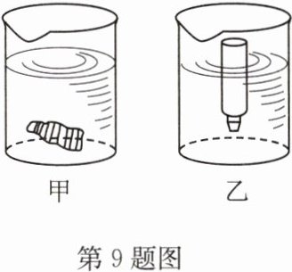 9. 用完的牙膏管,一次将它挤瘪并拧紧盖子,另一次向里面充入质量不计的空气将它撑开并拧紧盖子,两次先后放入同一杯水中,如图所示是牙膏管在水中的状态(液面不一定是真实情况),则两次所受的浮力$F_{甲}$和$F_{乙}$的大小关系是$F_{甲}\_\_\_\_\_\_F_{乙}$;两次排开水的体积$V_{甲}$和$V_{乙}$的大小关系是$V_{甲}\_\_\_\_\_\_V_{乙}$;两次杯底受到水的压强$p_{甲}$和$p_{乙}$的大小关系是$p_{甲}\_\_\_\_\_\_p_{乙}$;两次烧杯对桌面的压强$p'_{甲}$和$p'_{乙}$的大小关系是$p'_{甲}\_\_\_\_\_\_p'_{乙}$.(均填“$>$”“$=$”或“$<$”)