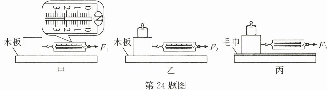 24. (8 分)(2025·苏州)探究影响滑动摩擦力大小的因素时,小明根据生活经验提出如下猜想:①与接触面粗糙程度有关;②与压力大小有关。